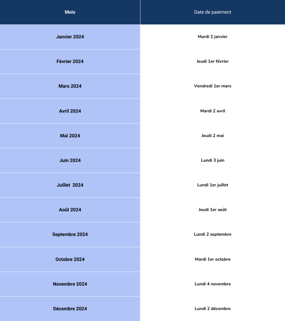 En 2024, votre retraite complémentaire Agirc-Arrco sera mise en paiement le premier jour ouvré de chaque mois aux dates indiquées dans le tableau ci-dessous :